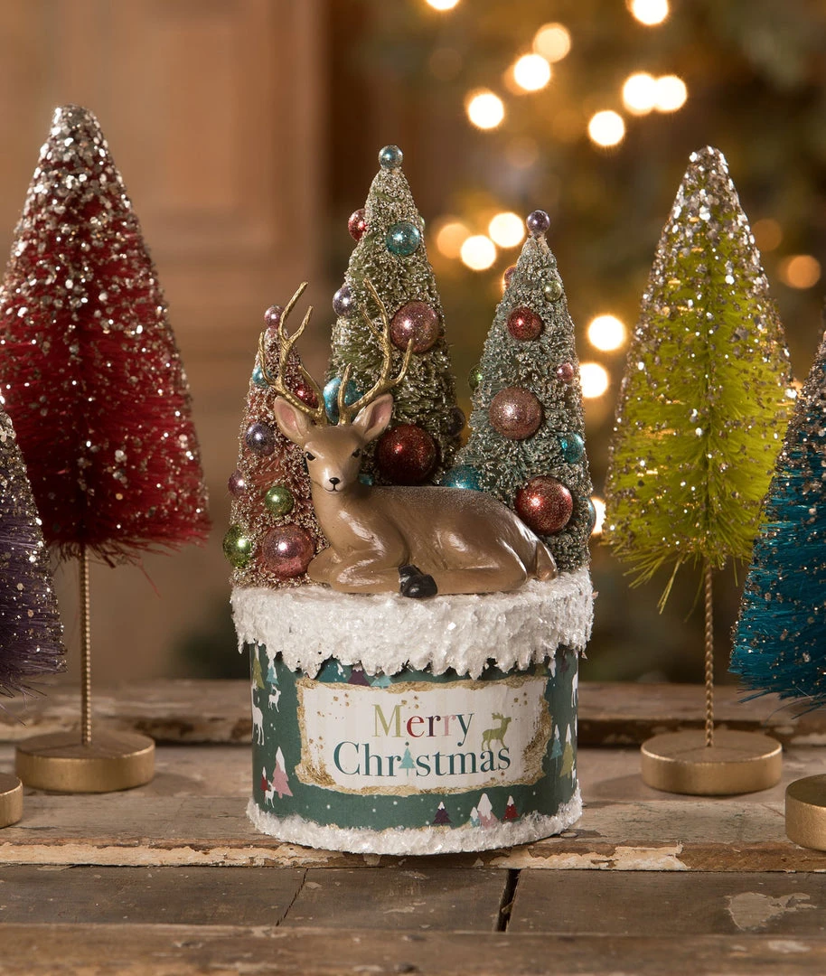 - Pressed paper box, resin, deer, bottle brush, plastic, glitter