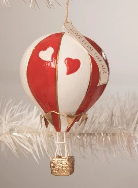 It’s all about the love this Valentine’s Day! Let your love fly high with this cute red and white striped hot air balloon ornament.