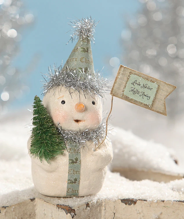 Bring a heart-warming touch to your Christmas decorating with The Littlest Snowman toting a “Love Never Melts Away Sign” designed by artist Michelle Allen.
