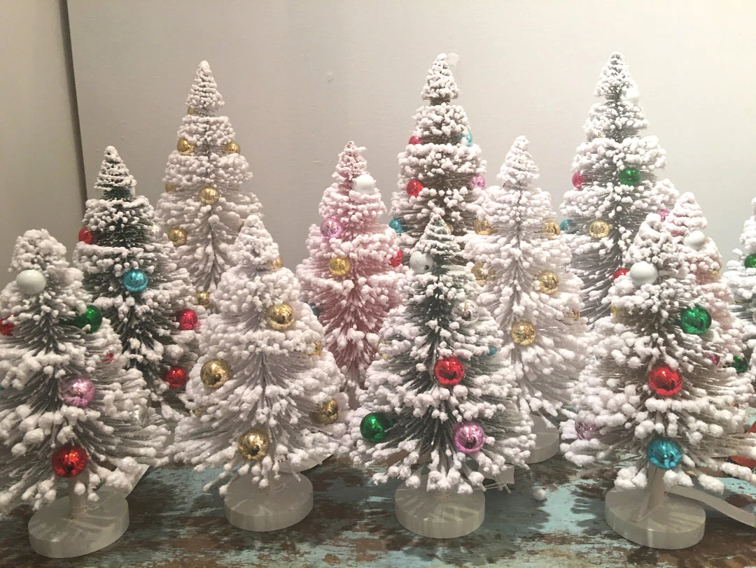 Create a winter white holiday scene with these White flocked bottle brush trees with silver balls.
