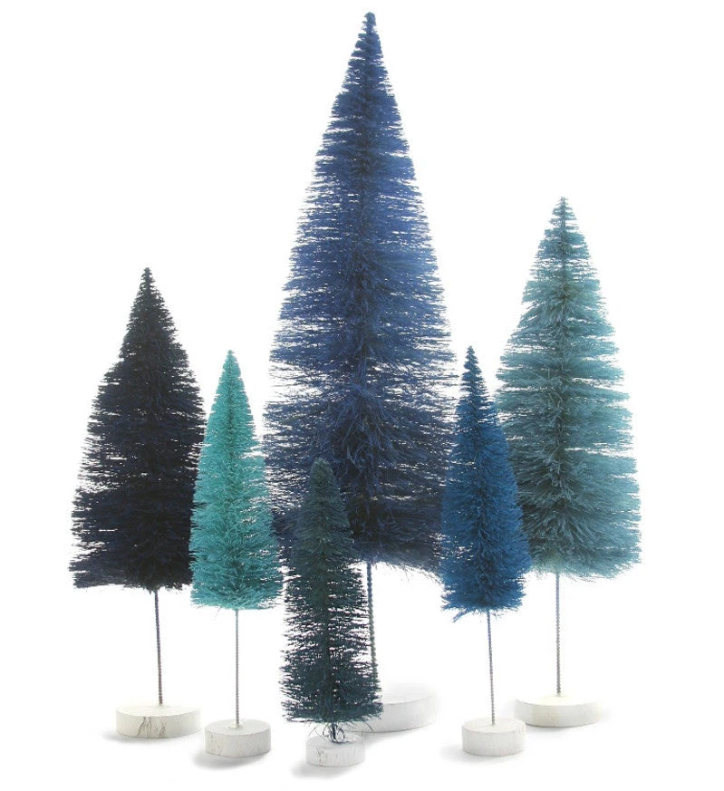 Create a stylish holiday vignette with these textural shades of Blue Bottle Brush trees that come in various sizes.