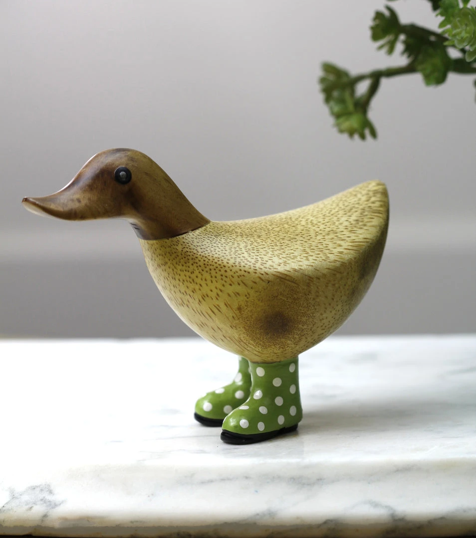 Brighten your day with this beautifully hand-crafted wooden duckling wearing green polka dot welly boots. Create your own unique duck family by adding other sizes or colors to your paddle.
