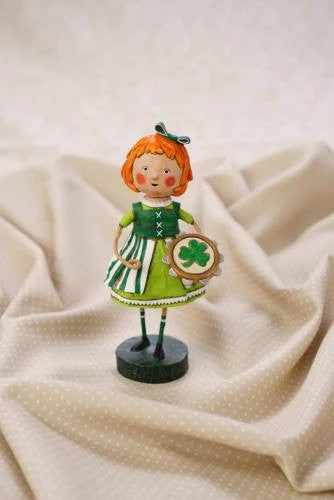 A sweet little Irish girl plays her lucky shamrock tambourine in her festive green St. Patrick’s day dress.