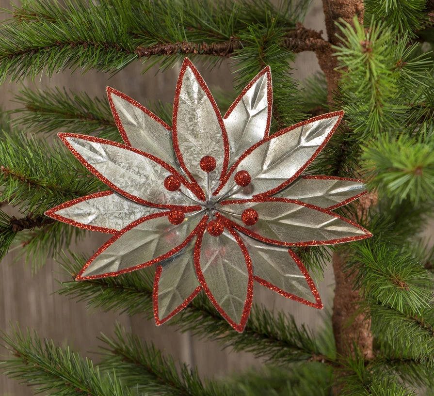 A different mid-century twist on the poinsettia flower. Clip-on metal Poinsettia Ornament has a reflective shine. It’s like jewelry for wreaths, trees, and mantle greens.
