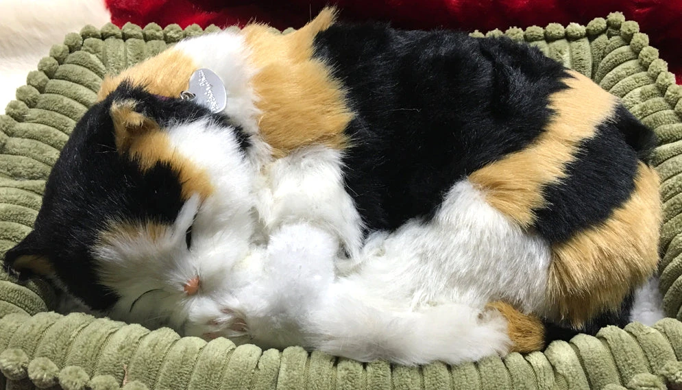 Adopt this adorable napping Calico Kitten. Its life-like breathing creates a soothing effect. Give the gift of comfort with this sweet little calico Kitty Cat.